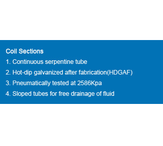 | The condensing coil is factory-assembled from high-quality steel tubing.The condensing coil has a design pressure of 2.0 MPa. It is tested by an encircling eddy current system and also at 2.5 MPa air pressure under water.The coil is designed with sloping tubes for free drainage Of the condensed liquid.The coil is encased in a steel framework and the entire assembly is hot-dip galvanized after fabrication. |